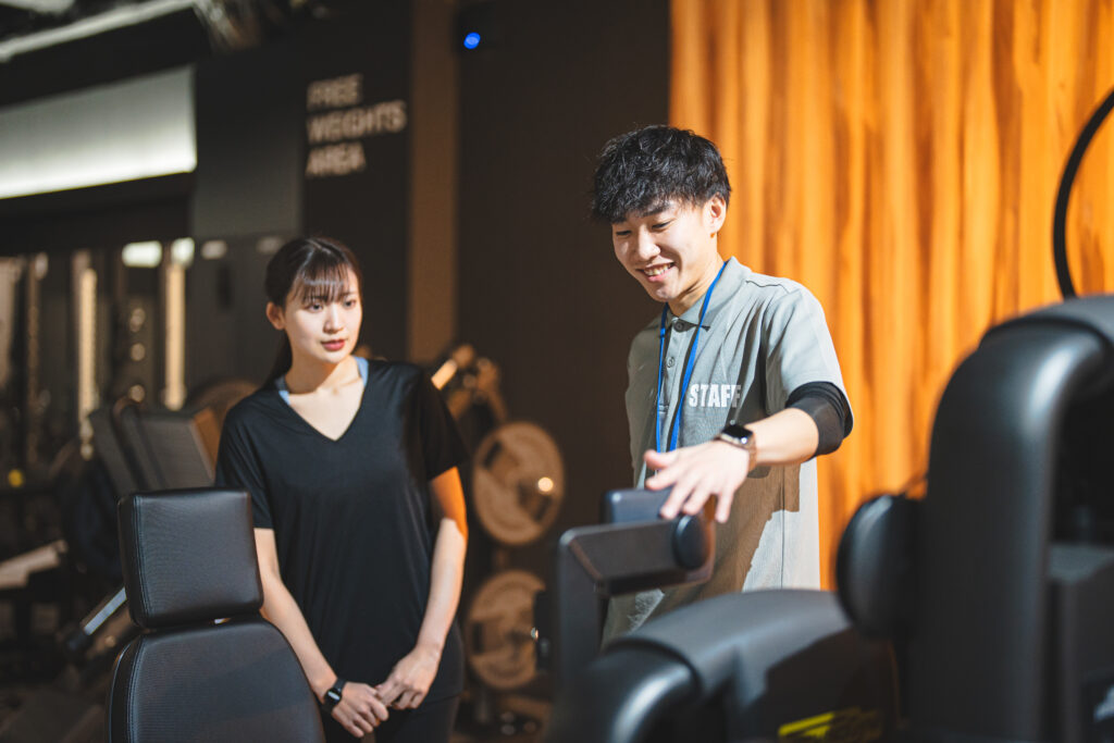 トレーニングマシンの使い方に不安がある方にも安心のサポート体制があります。初回はもちろん、いつでもスタッフに声をかければ説明を受けることができます。無理なくトレーニングできるよう、正しいフォームのチェックなども対応してくれます。